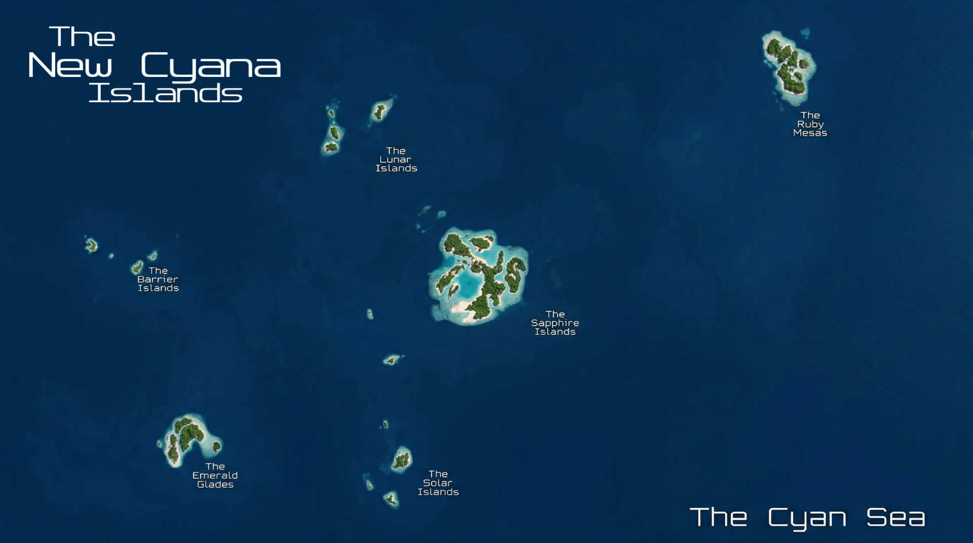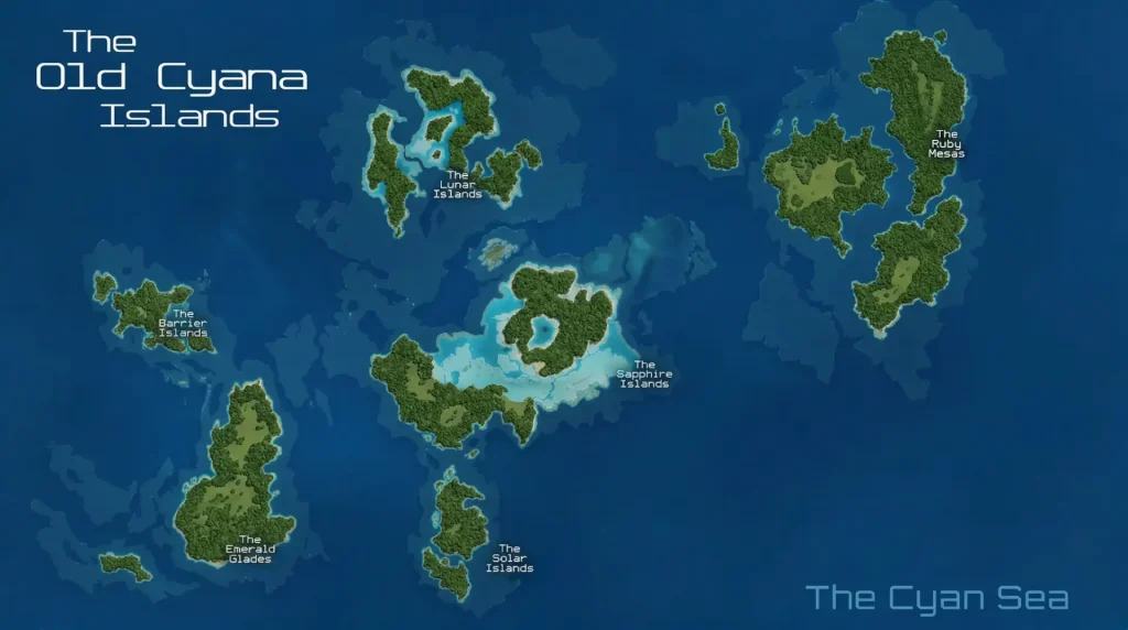 New Cyana is the surviving apex — the central Sapphire Islands and their surrounding satellite chains. What remains today is the tectonic high point of the entire formation, stabilized by the residual mantle uplift that once supported its predecessors. It is smaller in landmass than either Elder or Old Cyana at their peaks, yet more structurally secure. Coral development is dense. Reef walls form natural breakwaters. Lagoons remain unusually clear due to convergent current shielding created by the drowned shelves of its ancestors.